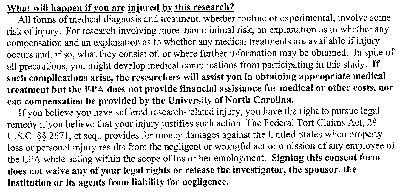 For study subjects injured by the research, EPA does explain their legal options — but this will change (and for the worse) as time goes on!