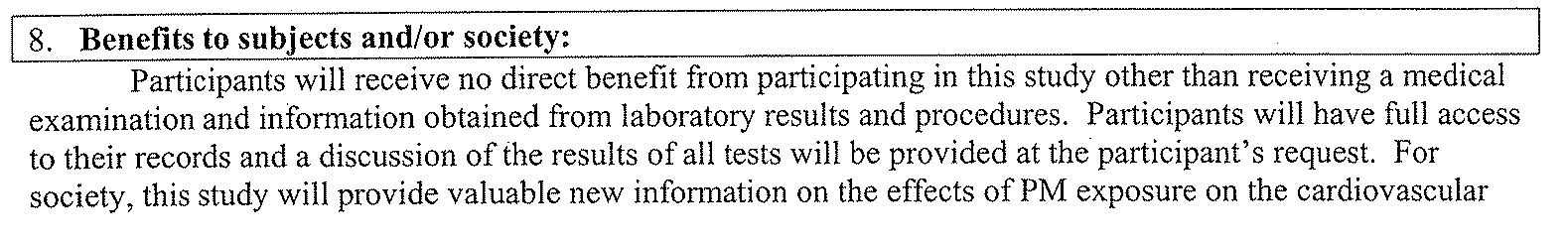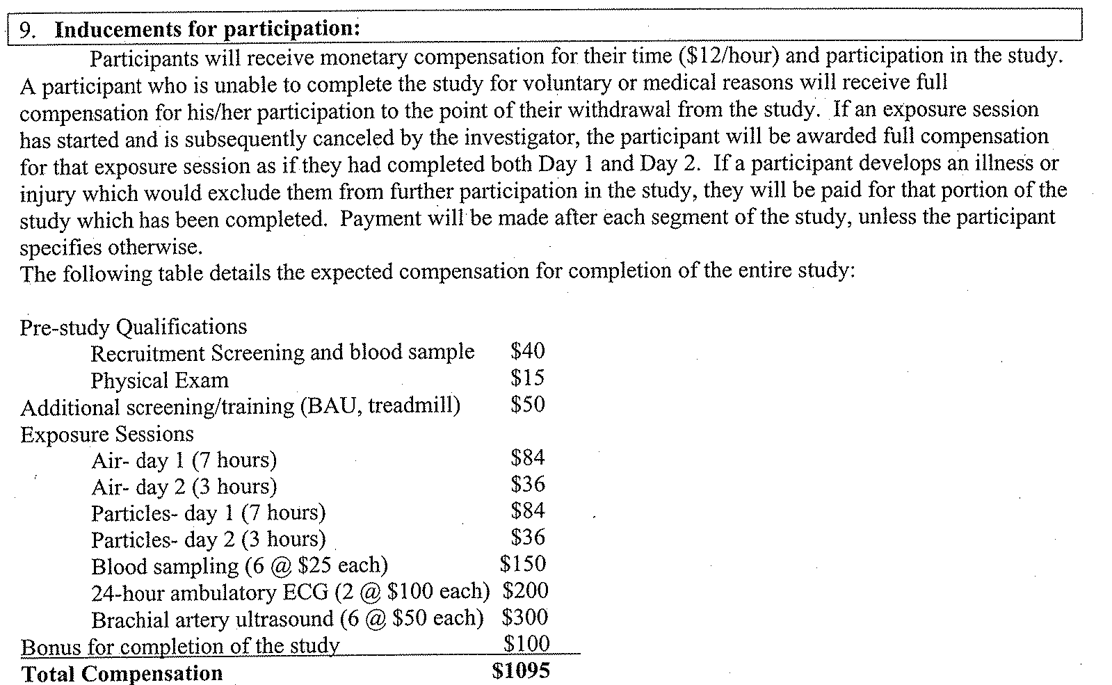 Of course, these study subjects are risking their lives and health for just EPA science alone. They’re earning $12 per hour up to a maximum of $1,095. Cha-ching!