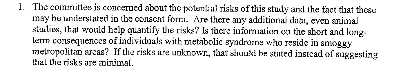 Check out this IRB-approved radio script used by the EPA to recruit patients. Note EPA emphasizes that study subjects could earn $1,200 for participating in the experiment. Apparently, there was not enough time to mention that study subjects would be risking their lives and health, too.
