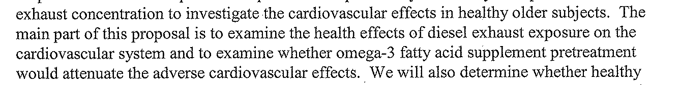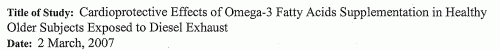 In 2007, the EPA began testing for the effects of diesel exhaust on “healthy, older adults” and whether dietary supplemanttion with omega-3 fatty acids would reduce any adverse effects of the diesel exhaust exposure [Click the images to enlarge].