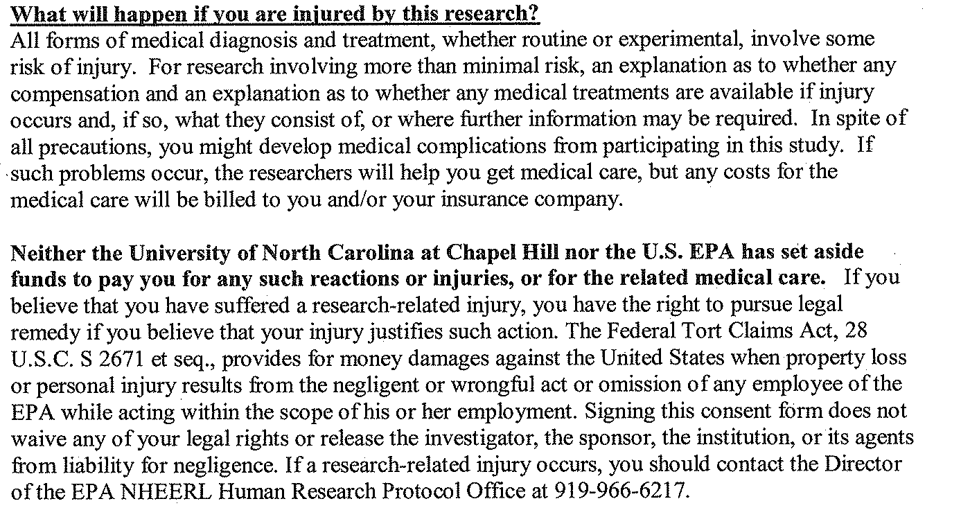 And should anything go wrong during the experiment, the EPA told study subjects that they are basically on their own.