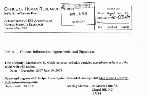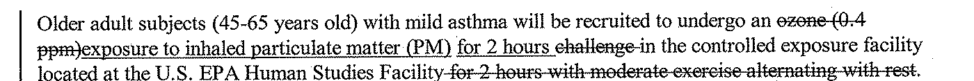 Starting in late-2006 the EPA began testing the effects of ozone on adult asthmatics. By June 2008, this morphed into testing PM2.5 on adult asthmatics.