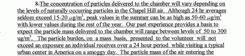 As usual, study subjects were to be exposed to very high levels of PM2.5, much higher than they would normally inhale in the Chapel Hill, NC-area — of course, not that any level of PM2.5 is safe, according to the EPA.