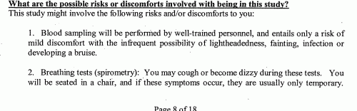 Check out this risk disclosure by EPA to the study subjects — not only does the PM2.5 risk get listed fourth, but the risk of dying is omitted and even the risk of asthma flare-up is minimized.