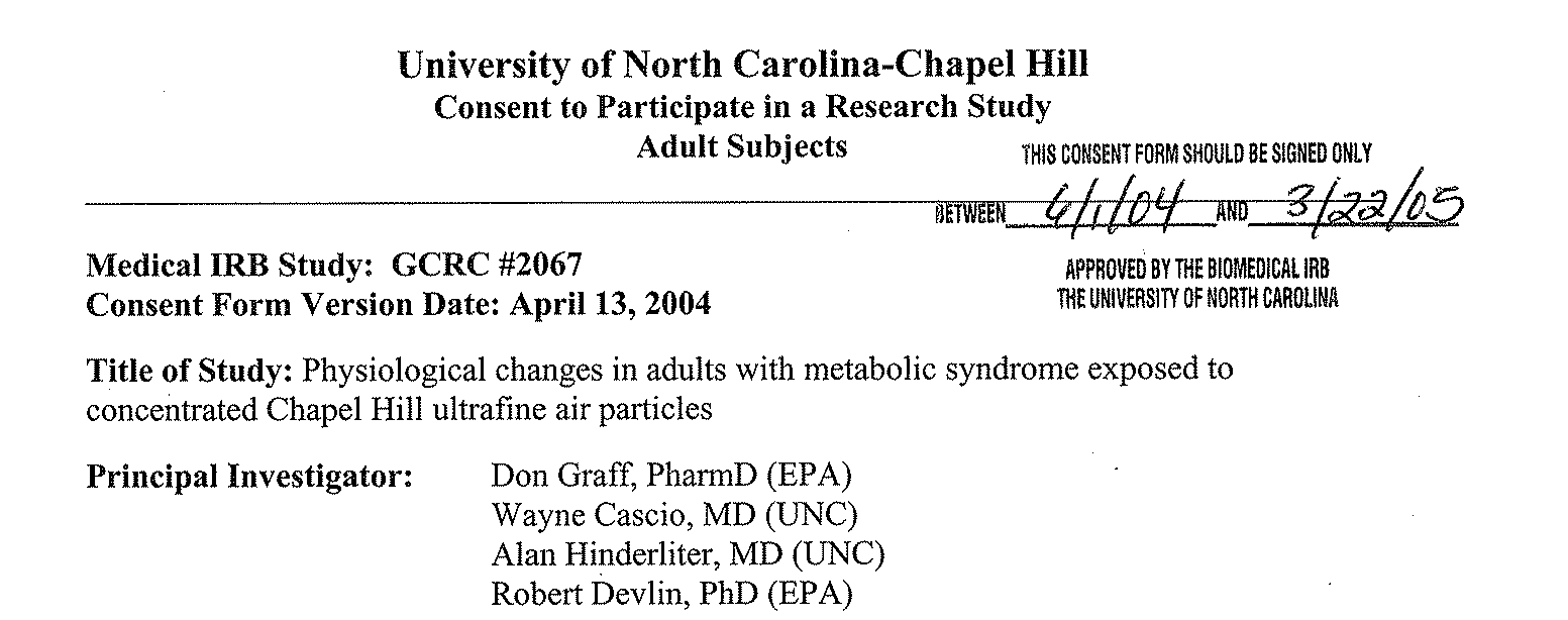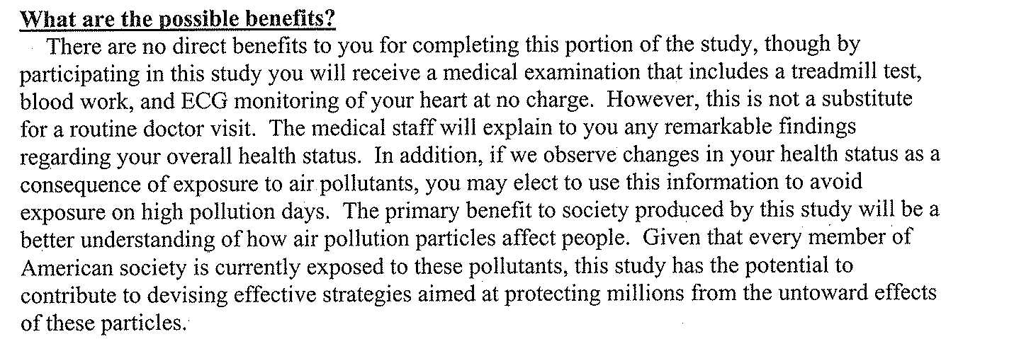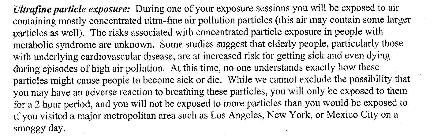 The Common Rule also prohibits exposing study subjects to risks greater than they would encounter in their daily lives. Here, people from the area surrounding Chapel Hill, North Carolina are being intentionally exposed to air equivalent to that from a big city on a bad air day. This disclosure is also deficient in its use of the term “smoggy day.” Smog and PM2.5 are different substances. This document dates from 2004, about the time EPA first concluded that PM2.5 can kill within hours of inhalation. So this consent form fails to fully disclose to the study subjects the risks of inhaling PM2.5. The mislabeling of the PM2.5 as “ultrafine particles” may be inadvertent or possibly an effort to conceal the true nature of the actual exposure (i.e., PM2.5). As of the date of this study, EPA was still studying ultrafine particles for potential health effects. Even so, testing potential toxins on humans to see if they, in fact, are dangerous also violates human experimentation rules.