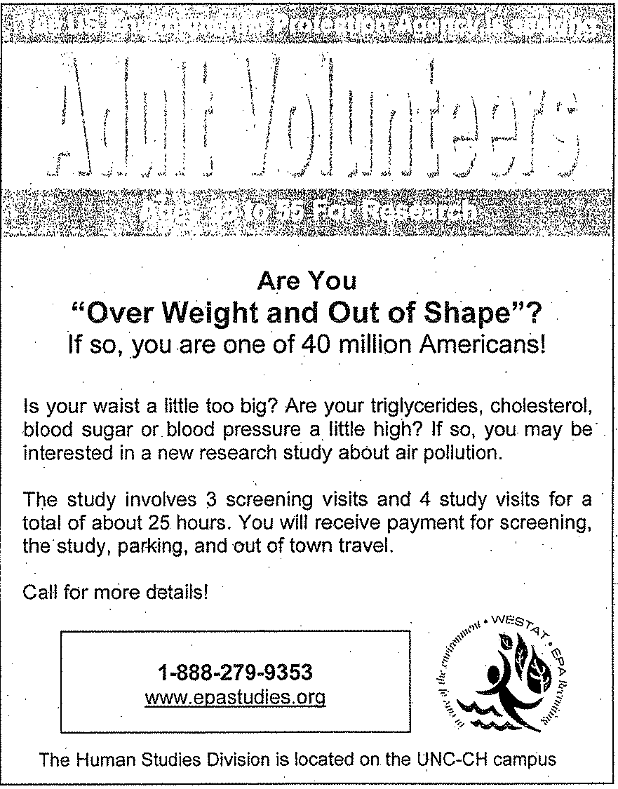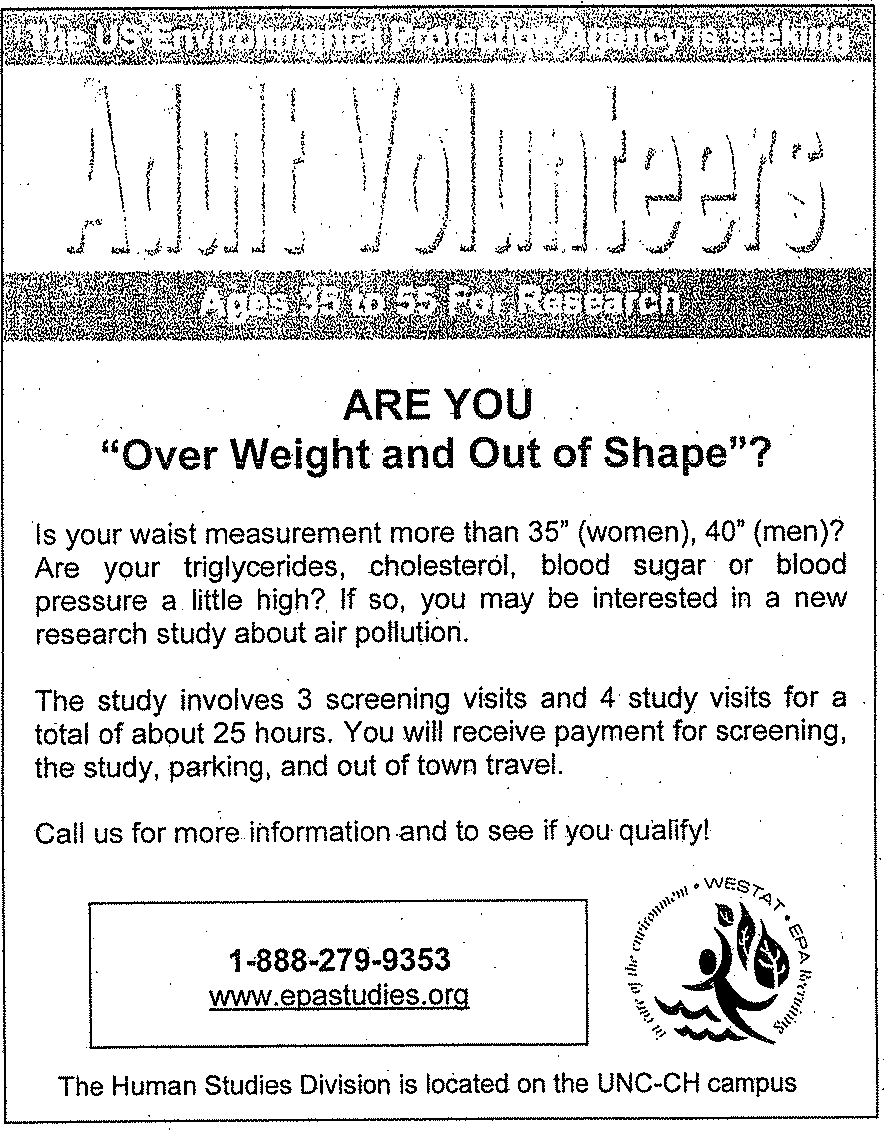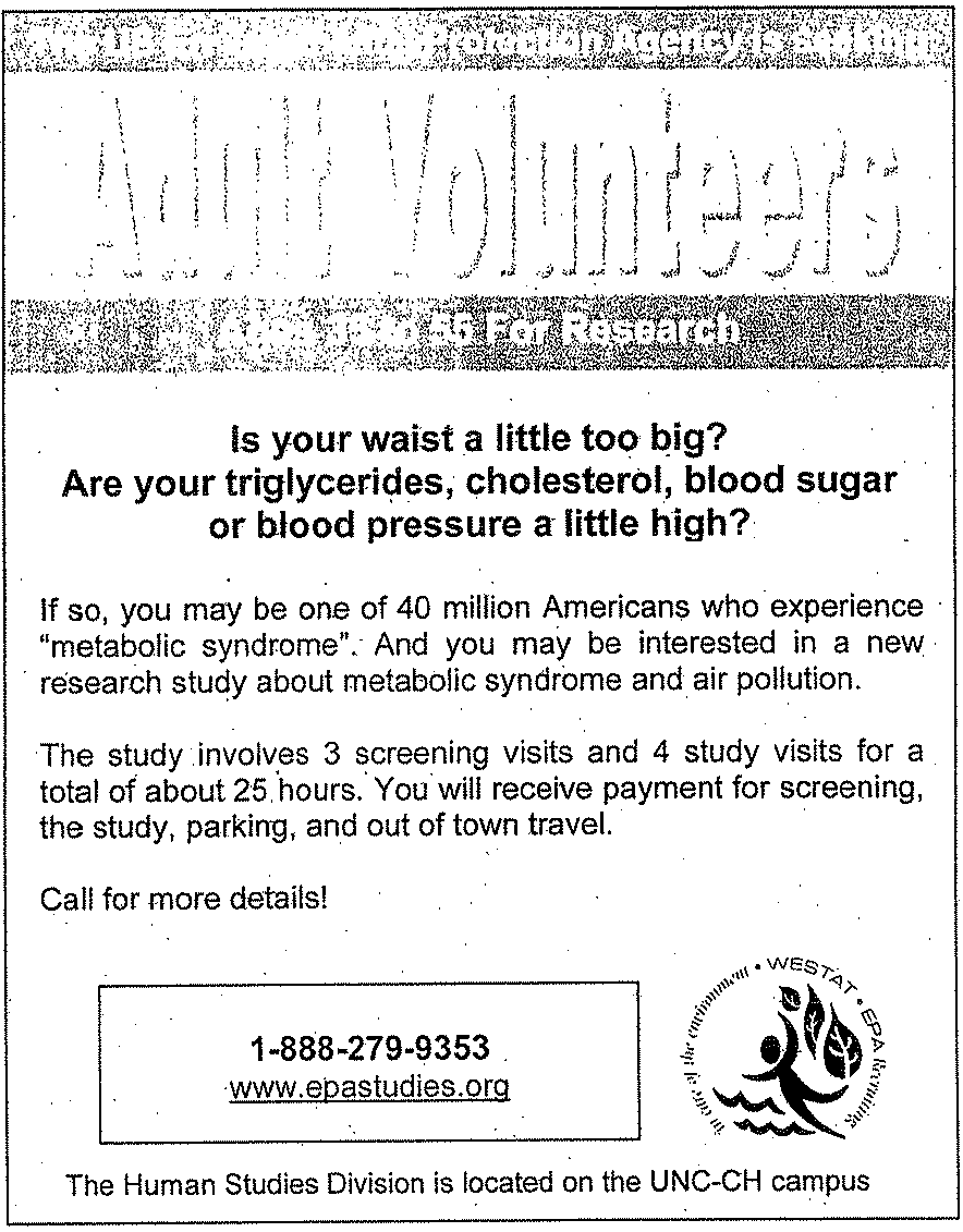 So how did EPA find its human guinea pigs — and what type of human guinea pigs were they looking for? With newspaper ads (like those below), the EPA was looking for adults with “metabolic syndrome” [Click images to enlarge].