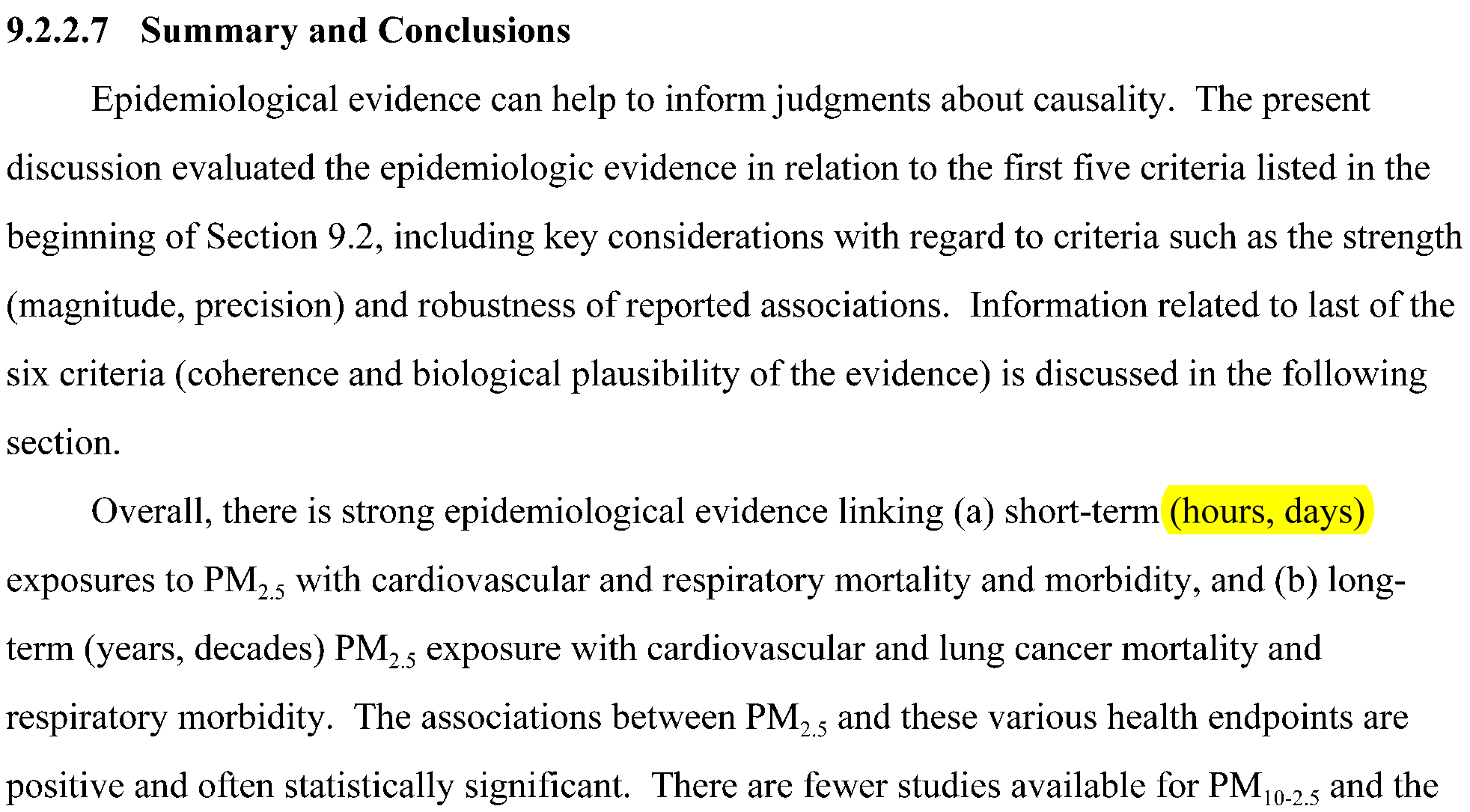 EPA reiterated this view in its 2009 scientific assessment (Page 7-81) of PM2.5 as below [Click to enlarge].