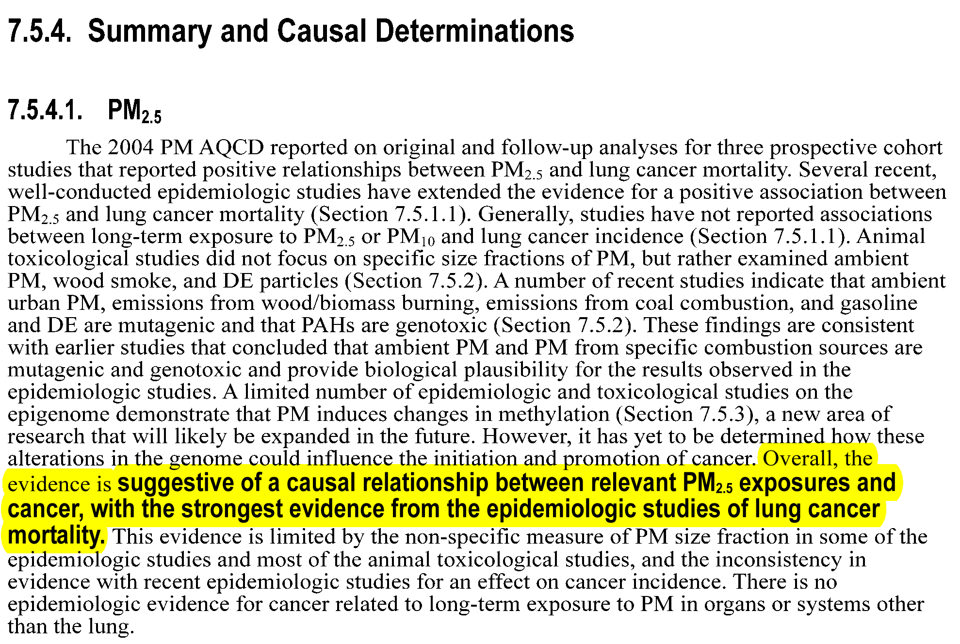 In its most recent official scientific assessment of PM2.5, the EPA concludes on page 6-182 [Click to enlarge the excerpt]: