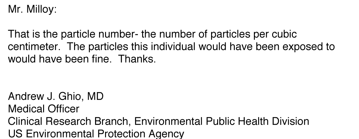 On September 19, 2011, EPA medical officer Dr. Ghio responded to Steve Milloy’s September 15 inquiry about the nature of the concentrated ambient particles as follows [Click to enlarge]: