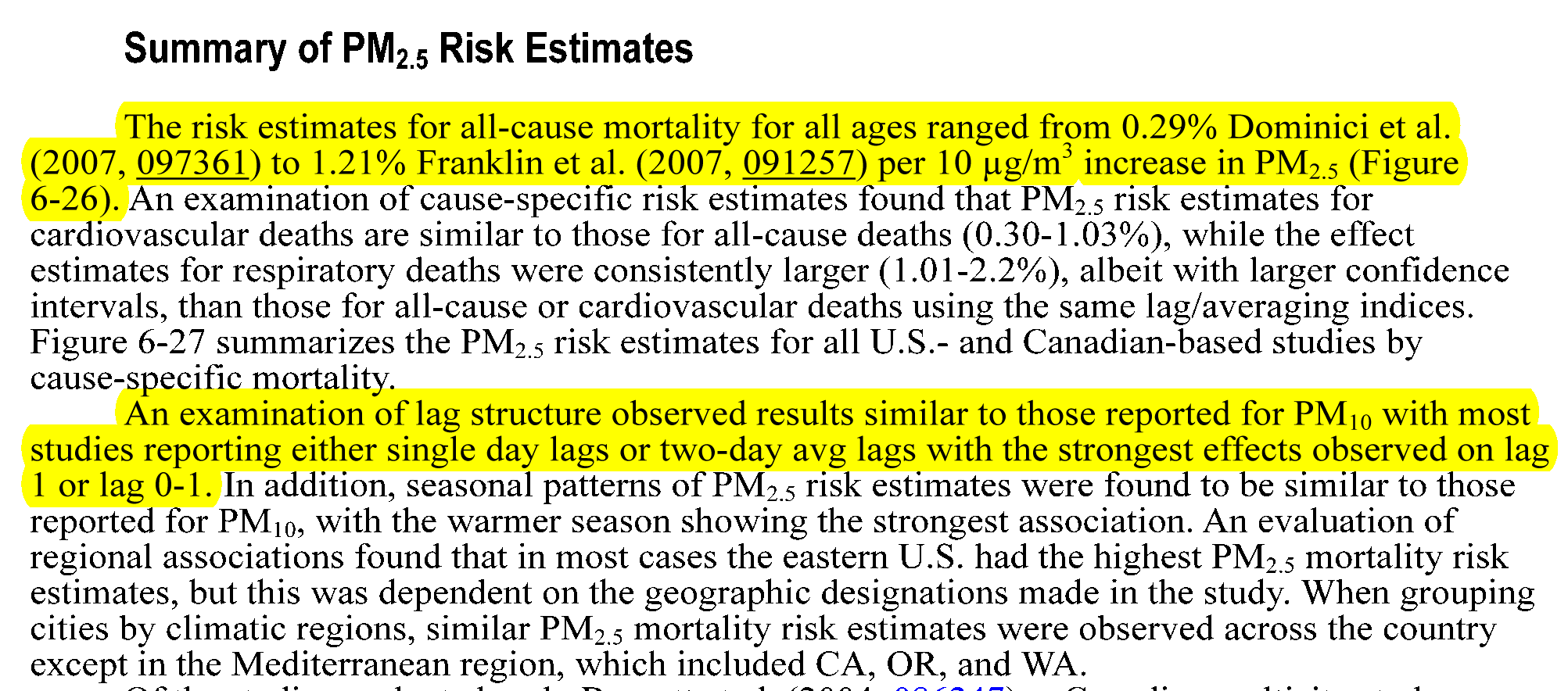 As if that is not dire enough, the second highlighted statement, including the phrase “with the strongest effects observed on lag 1 or lag 0-1, means that breathing air with PM2.5 can kill within hours of inhalation. (“Lag” means time since inhalation. “Lag 1” is one day after inhalation. “Lag 0-1” is less than one day after inhalation.)