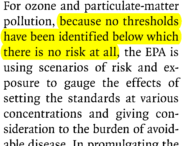 The no-safe-threshold of exposure view of PM2.5 was recently emphasized in a July 7, 2011 commentary in the New England Journal of Medicine authored by Jonathan Samet, the chairman of the EPA’s Clean Air Scientific Advisory Committee, as follows [Click to enlarge]:
