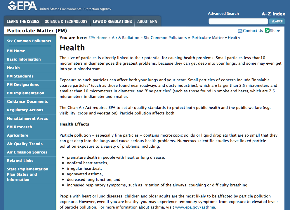 Below is how EPA introduces its website visitors to airborne particulate matter pollution [Click to enlarge]: