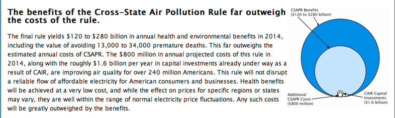 The EPA’s justified its July 2011 regulation known as the Cross-State Air Pollution Rule by claiming the monetized health benefits of the rule (virtually all of which arise from the EPA’s assertion that the rule would reduce deaths by reducing PM2.5 and then valuing each life saved by approximately $8 million) justify the rule’s compliance costs, as shown in the excerpt below from EPA’s web site. [Click to enlarge].